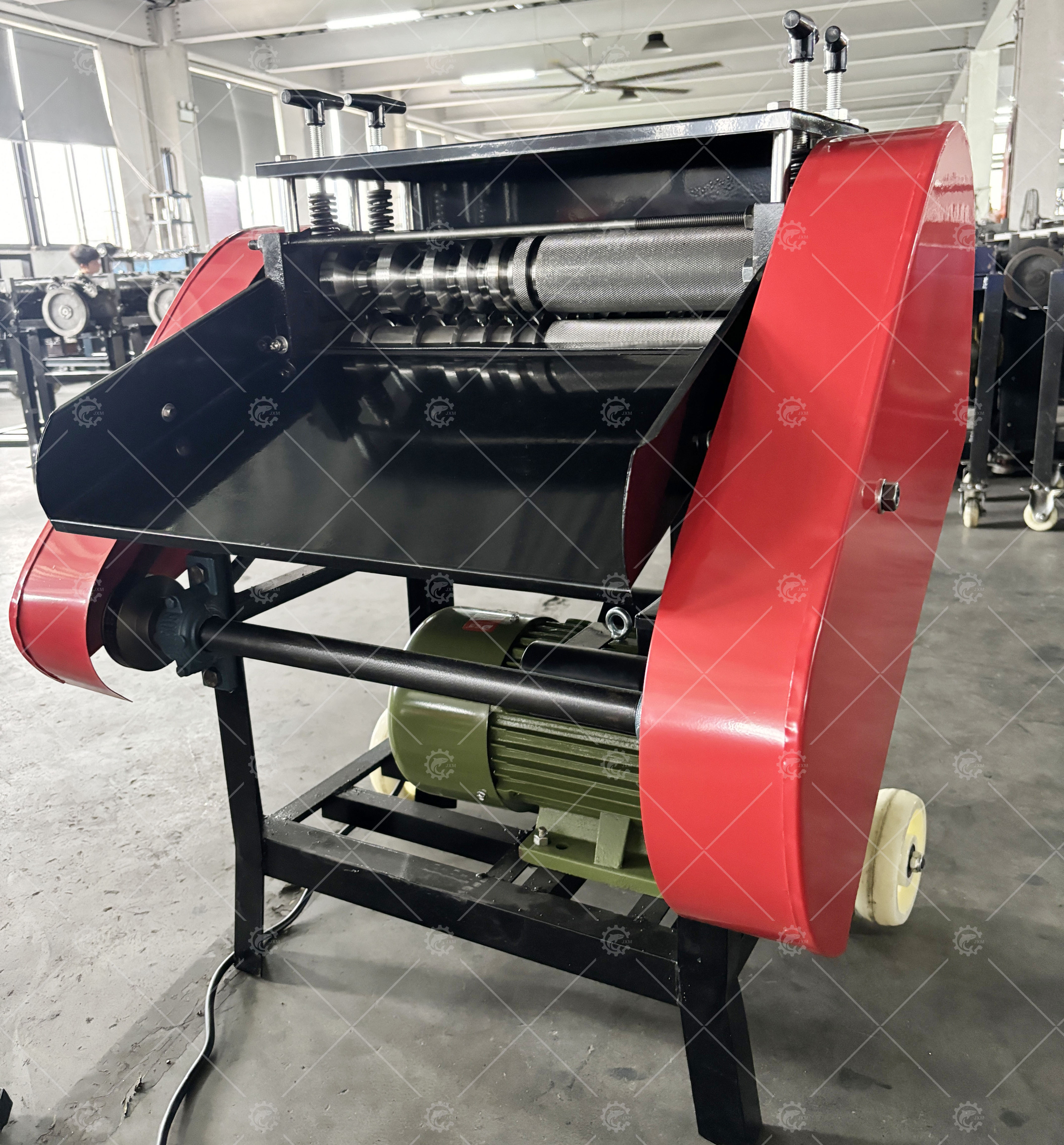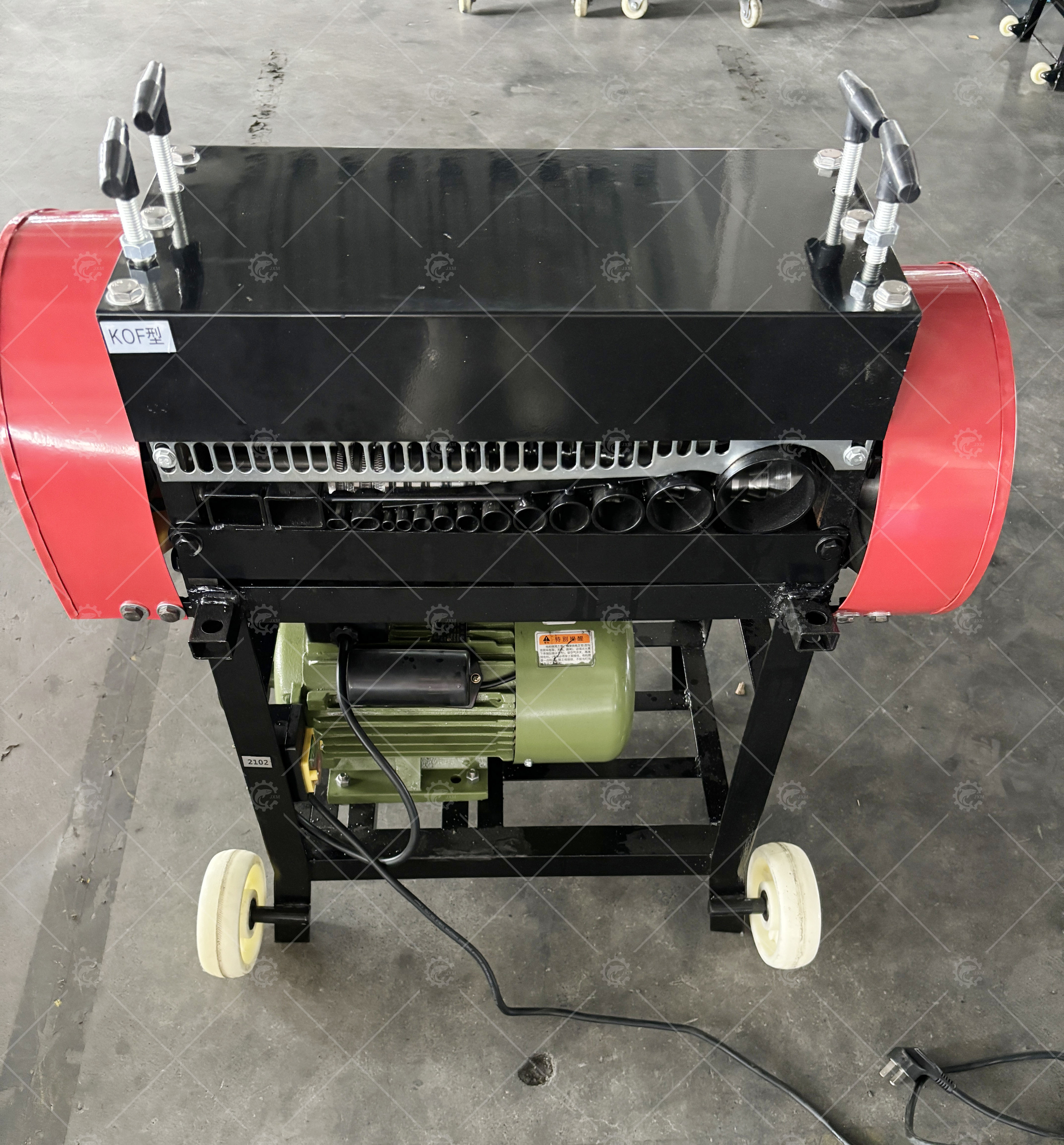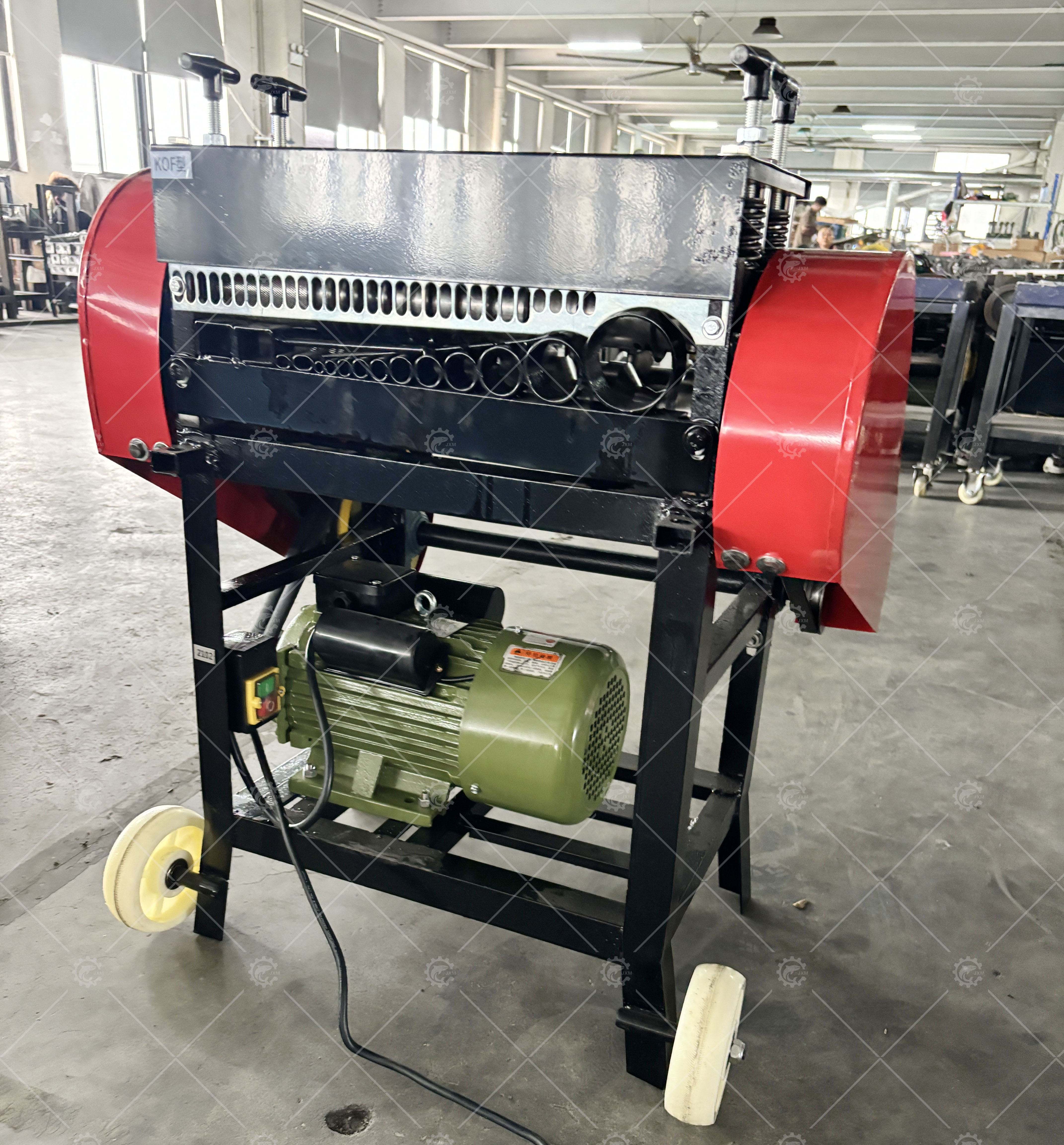 The JX-KOF Cable Wire Stripping Machine is designed to separate plastic insulation from core wires, enabling the recovery of copper and aluminum. It achieves cable core separation through cutting and squeezing mechanisms. Equipped with 15 holes, the machine accommodates wires ranging from 1.5–55mm in diameter.